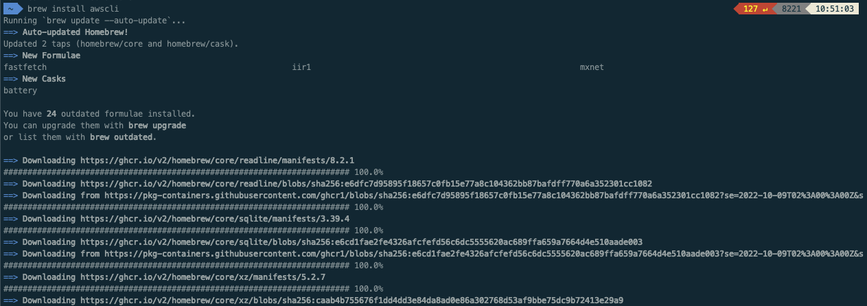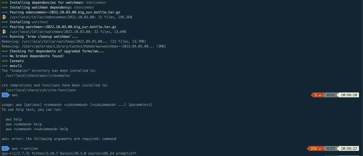 ==> Installing dependencies for awscli: readline, sqlite, xz, python@3.10 and six