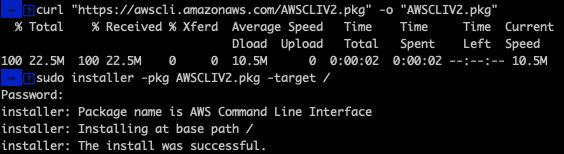 sudo installer -pkg AWSCLIV2.pkg -target /