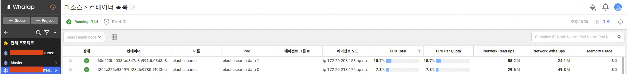 ㅇ 144개의 컨테이너 중에서 elasticsearch data의 CPU와 메모리 사용량이 제일 높다.