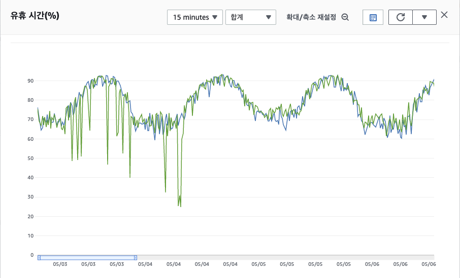 ㅇ 모니터링 중 유휴시간이 20%까지 떨어지는 특이점을 발견하여 분석을 시작하였다.