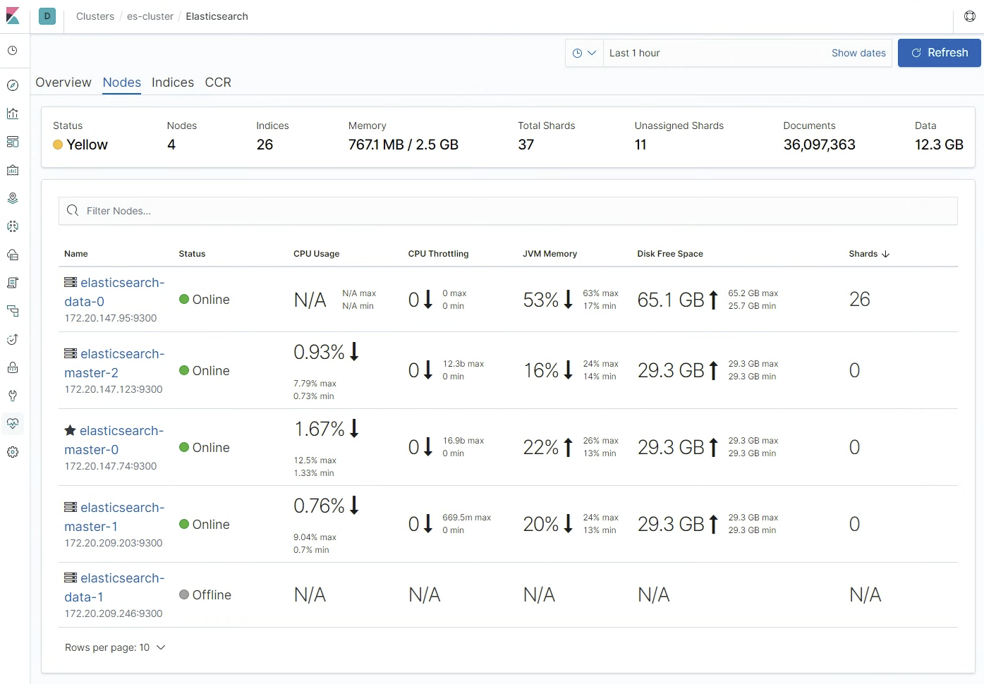 ㅇ 키바나에서 elasticsearch data-1이 Offline이 되었고, Status는 Yellow 상태가 되었다.
