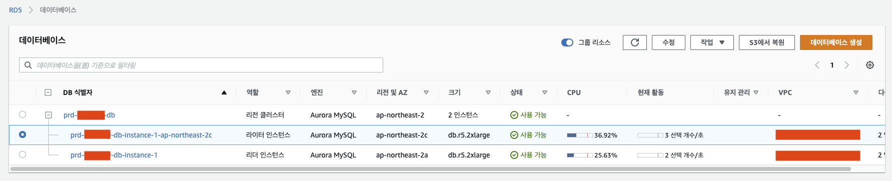 ㅇ 현재 디비는 master와 read 인스턴스, 이중화로 구성되어 있다.