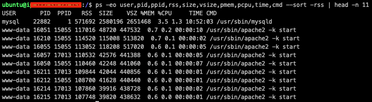 ps -eo user,pid,ppid,rss,size,vsize,pmem,pcpu,time,cmd --sort -rss | head -n 11