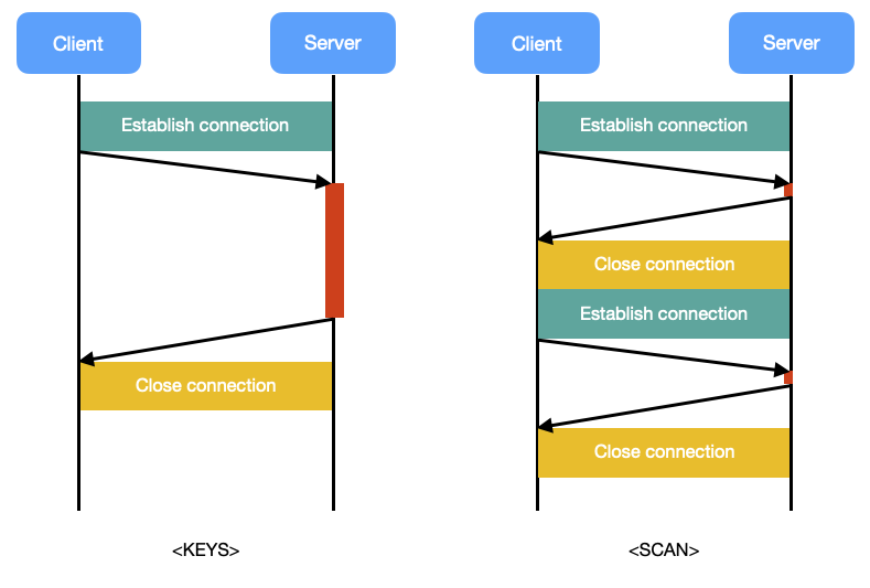 한편으로 이를 개선하기 위해 scan을 사용한 적이 있었다. scan이 count기준으로 데이터를 분산요청하였고, count 단위가 작은 경우 Redis까지 요청을 보내고 응답을 받을때까지의 네트워크 I/O가 발생하기도 한다. SCAN의 경우 다른 요청에 대한 blocking을 최소화할 수 있지만 처리하는 프로세스 자체는 지연이 발생하는 문제점이 발생하기도 하였다.