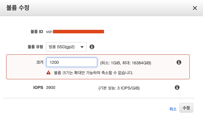 ㅇ 볼륨의 용량과 IOPS를 수정한다.