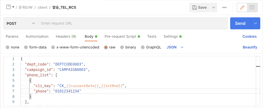 [Postman] 테스트 발송 시 현재시간, 램덤숫자 넣기 본문