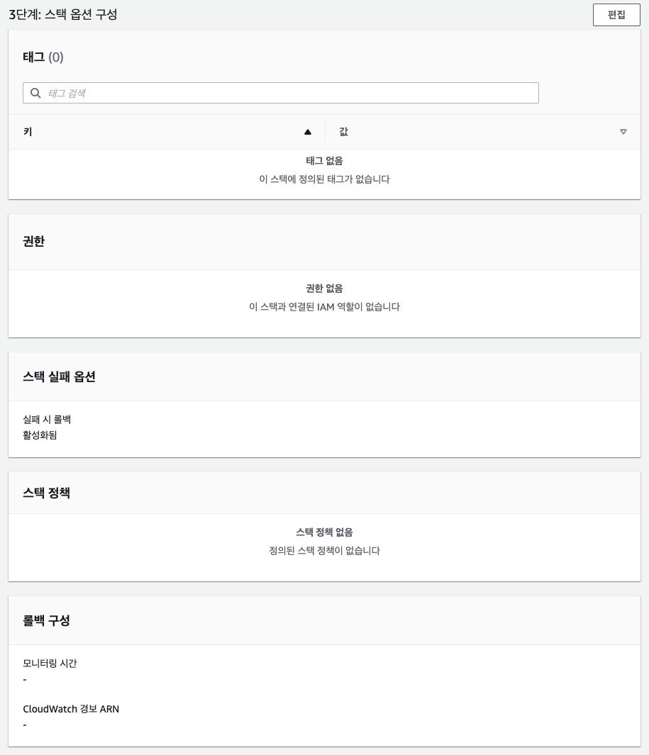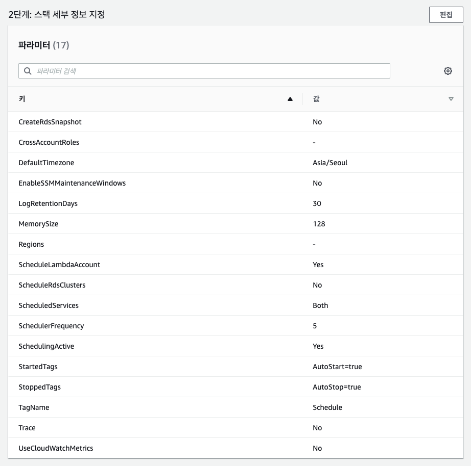 ㅇ 파마메터 설정 창으로 이동 후에 스택이름을 지정하고 특정 파마메터에 대해서만 정리하였다.