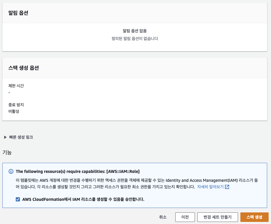 ㅇ "AWS CloudFormation에서 IAM 리소스를 생성할 수 있음을 승인합니다." 을 체크한다.