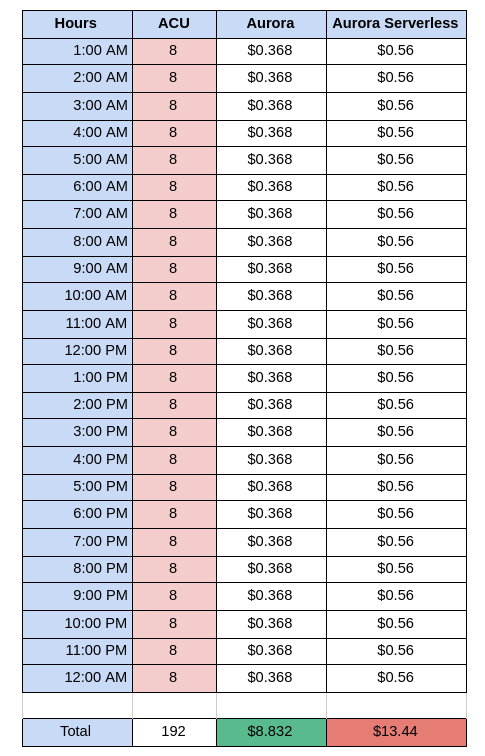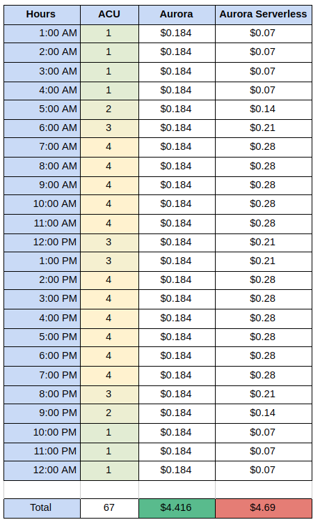 이 예에서 비용 비교는 어느 선택(Aurora 또는 Aurora Serverless)이 회사에 적합할 수 있음을 나타냅니다. 데이터베이스 사용량이 최소인 하루 중 상당한 시간(근무 시간 외)이 있습니다. 그러나 데이터베이스 사용량이 최대인 하루 중 많은 시간(오전 7시 - 오후 7시)도 있습니다.