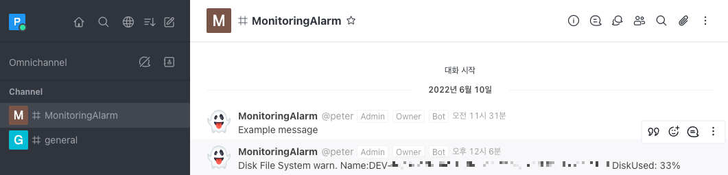ㅇ 예전에 작성한 "[Rocket.Chat] Incoming WebHook Script"을 참조하여 API를 생성하면 된다.