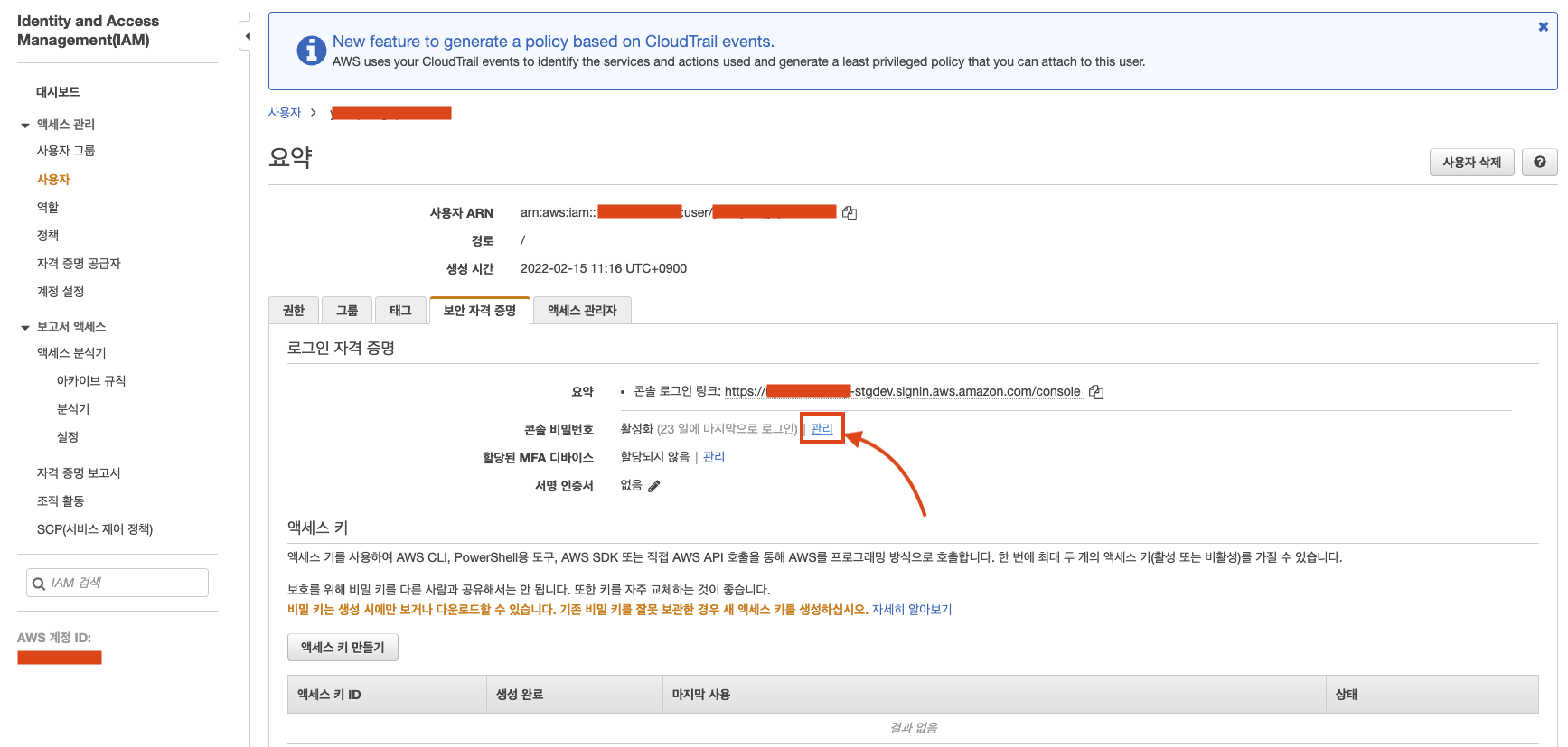 ㅇ 보안 자격 증명(Security credentials) 탭을 선택한 다음, 로그인 자격 증명(Sign-in credentials)에서 콘솔 비밀번호(Console password) 옆에 있는 관리(Manage password)를 선택한다.