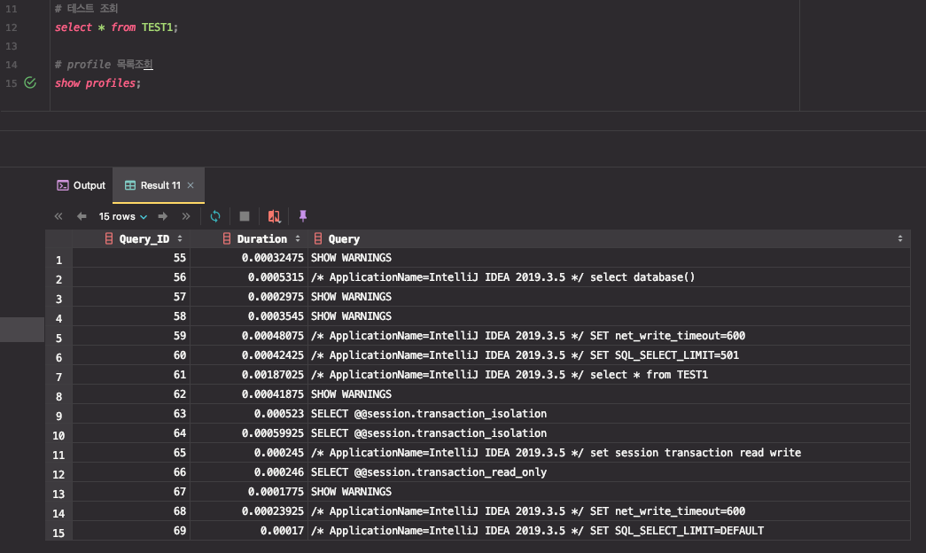IDEA에서 데이터베이스에 접근하고 있는 상황에서 테스트 조회를 하였지만, 툴에서 기본적으로 실행하는 쿼리 사항까지 확인 할 수 있었다. 테스트 조회 시 Query_ID 61 항목에서 확인 할 수 있으면 수행 시간이 0.00187025초 임을 알 수 있다.