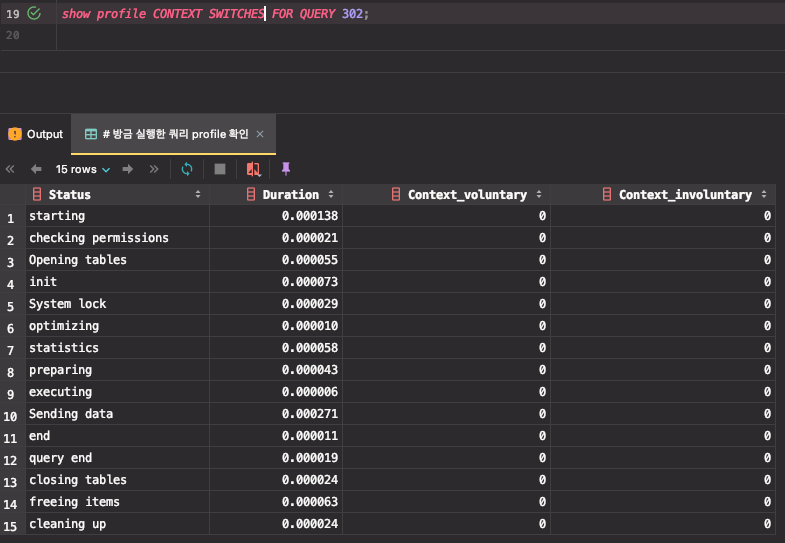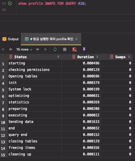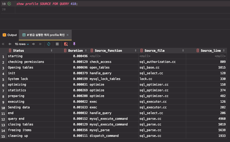 SHOW PROFILE은 향후 MySQL 릴리스에서 제거될 것으로 예상되며, 대신 MySQL Performance Schema를 사용할 수 있다.