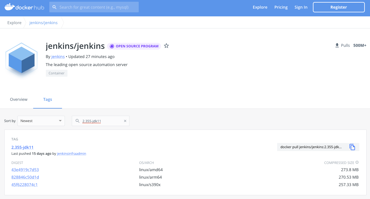 ㅇ Docker hub의 jenkins/jenkins에서 적절한 Tag를 찾아야한다.