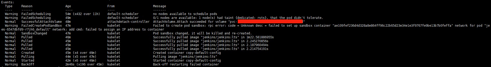 Warning FailedCreatePodSandBox 47m kubelet Failed to create pod sandbox: rpc error: code = Unknown desc = failed to set up sandbox container "ae109fef236d4d328a8e864ff96c22b65d23e34e1e3f9767fe9be13b7b0feffa" network for pod "jenkins-kubernetes-6547dbfd9-r7jh6": networkPlugin cni failed to set up pod "jenkins-kubernetes-6547dbfd9-r7jh6_default" network: add cmd: failed to assign an IP address to container