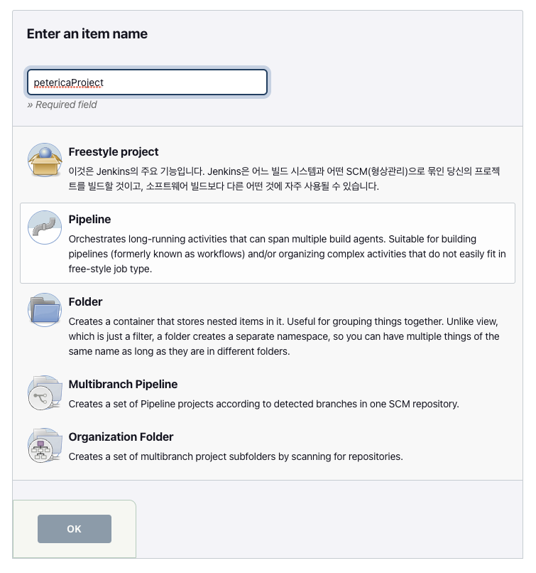 ㅇ 프로젝트 이름을 입력하고 Pipeline을 선택하여 OK버튼을 클릭한다.
