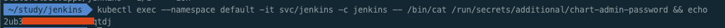 kubectl exec --namespace default -it svc/jenkins -c jenkins -- /bin/cat /run/secrets/additional/chart-admin-password && echo