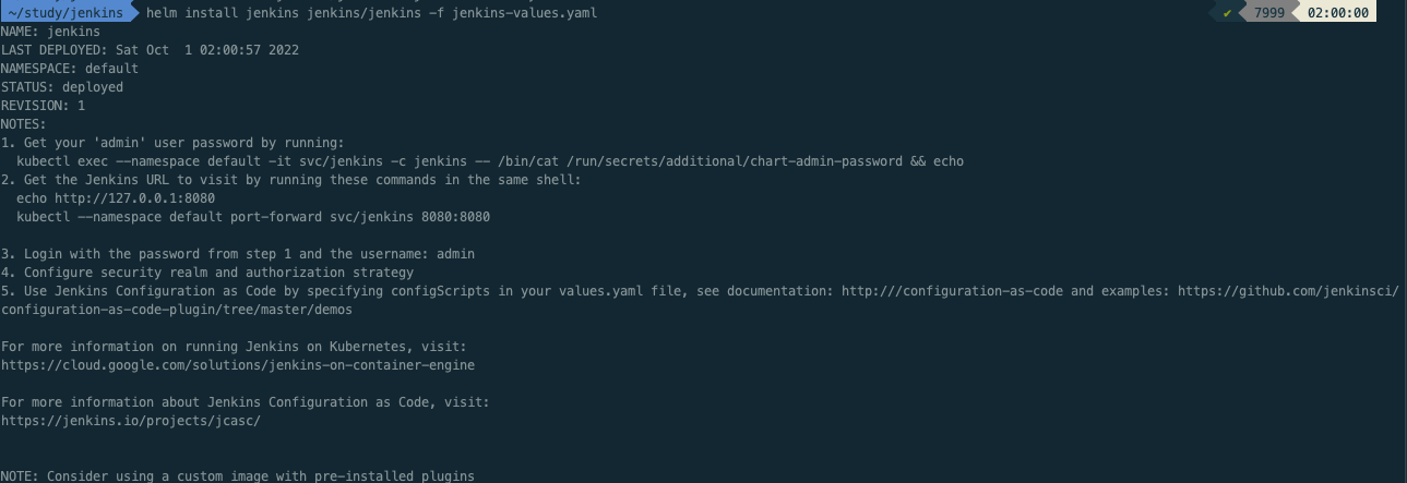 $ helm install jenkins jenkins/jenkins -f jenkins-values.yaml