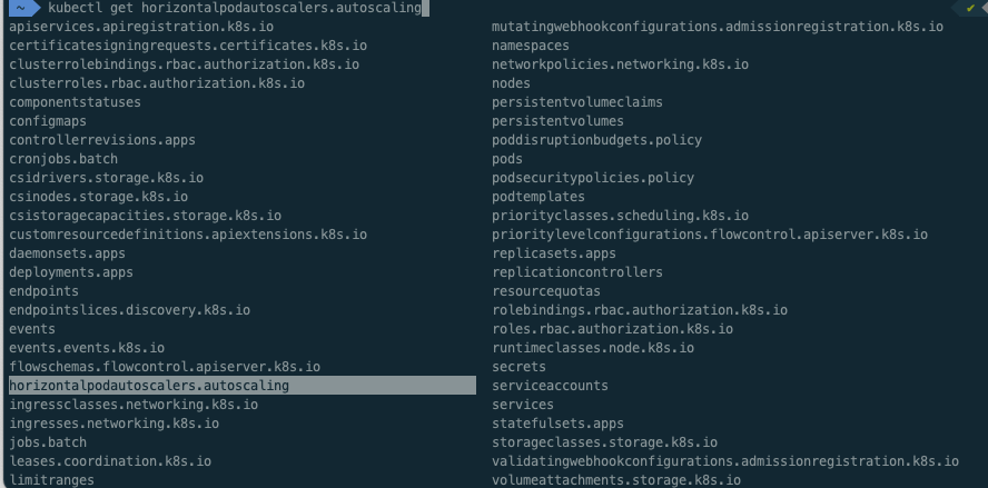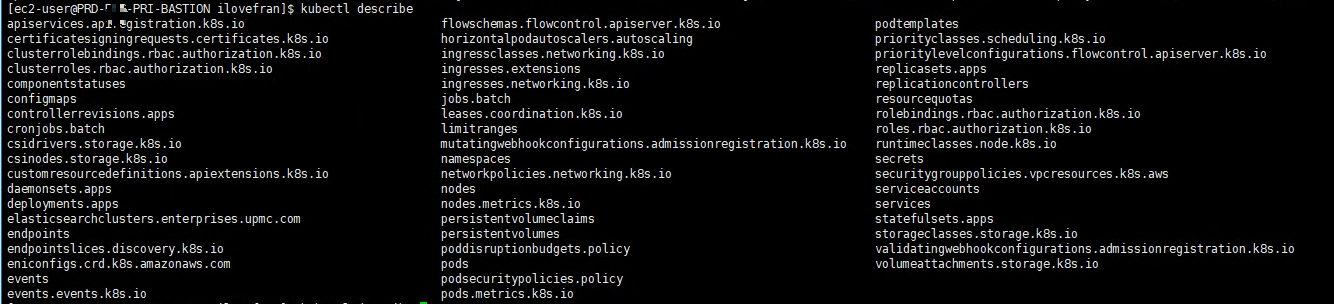 ㅇ kubectl des 이후 탭키를 누르면 describe 명령어가 완성되고, 다시 탭키를 누르면 상세정보를 볼 수 있는 오브젝트 목록을 확인할 수 있다.