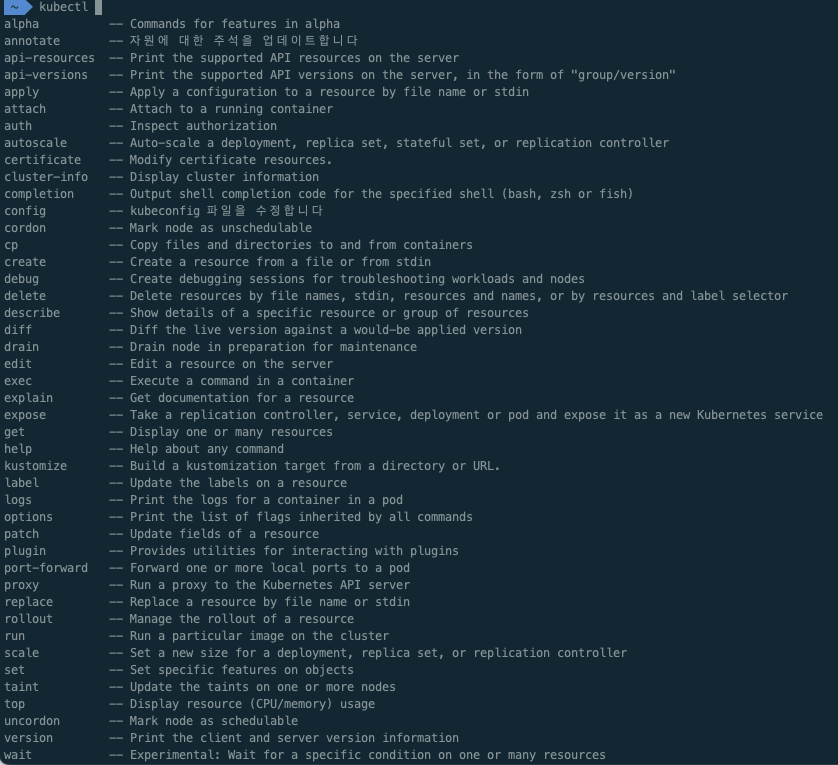 ㅇ kubectl 이후 탭키를 누르면 사용가능한 명령어 목록과 설명이 나온다.