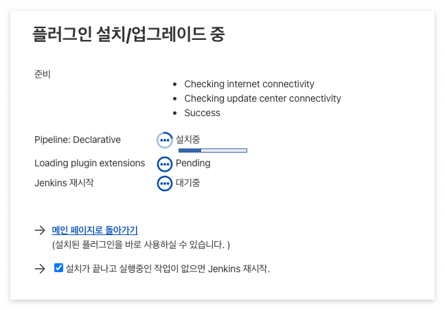 ㅇ 설치가 끝나고 실행중인 작업이 없으면 Jenkins 재시작. 체크!!