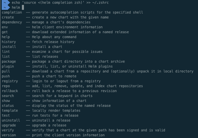 $ echo 'source <(helm completion zsh)' >> ~/.zshrc