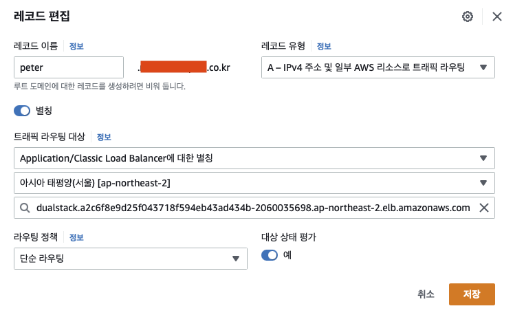 ㅇ 기존에 사용 중이던 peter.**********.co.kr 서브도메인을 수정하여 로드밸런스를 연결하였다.