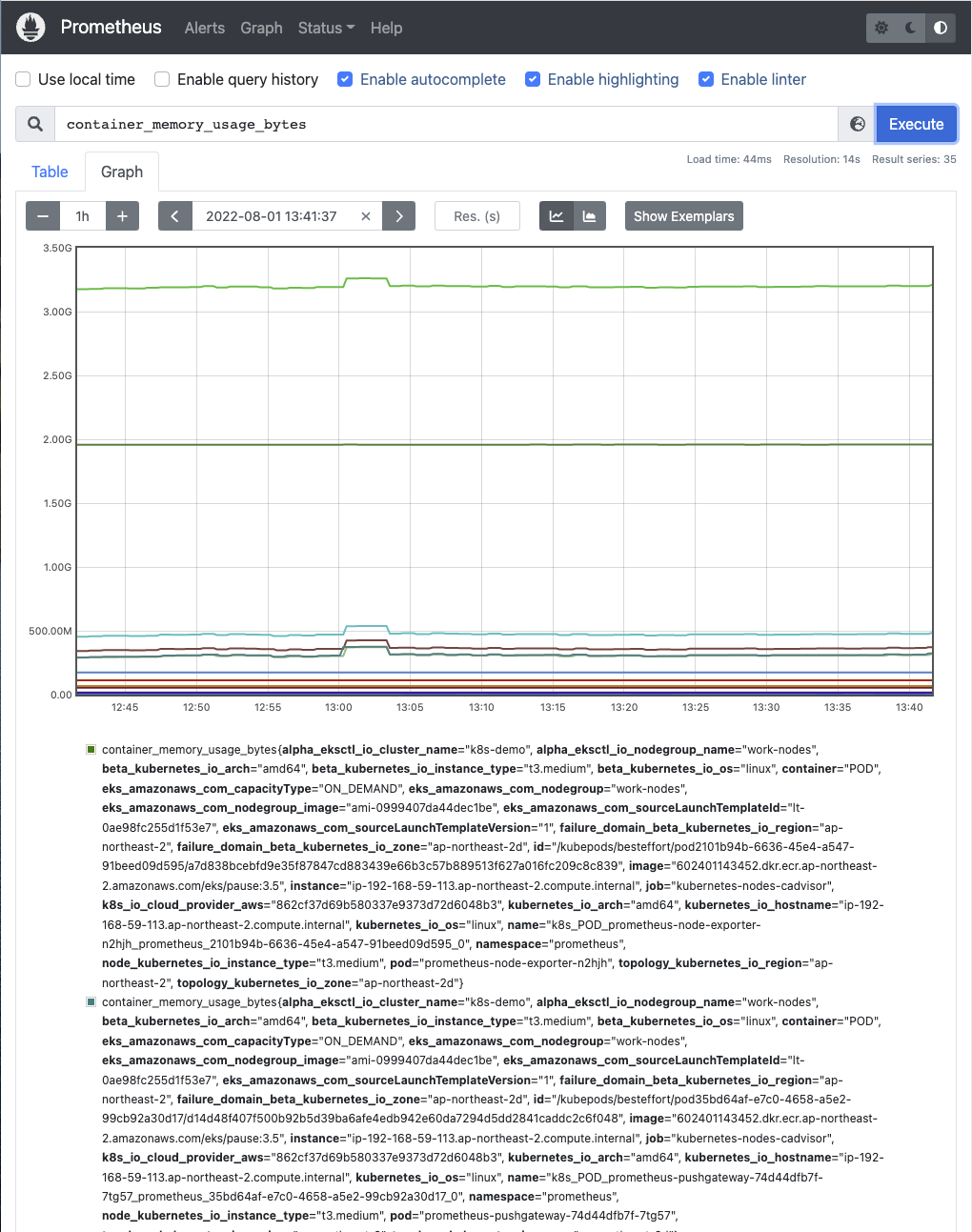 ㅇ container_memory_usage_bytes 입력한 후 실행한 모습이다.