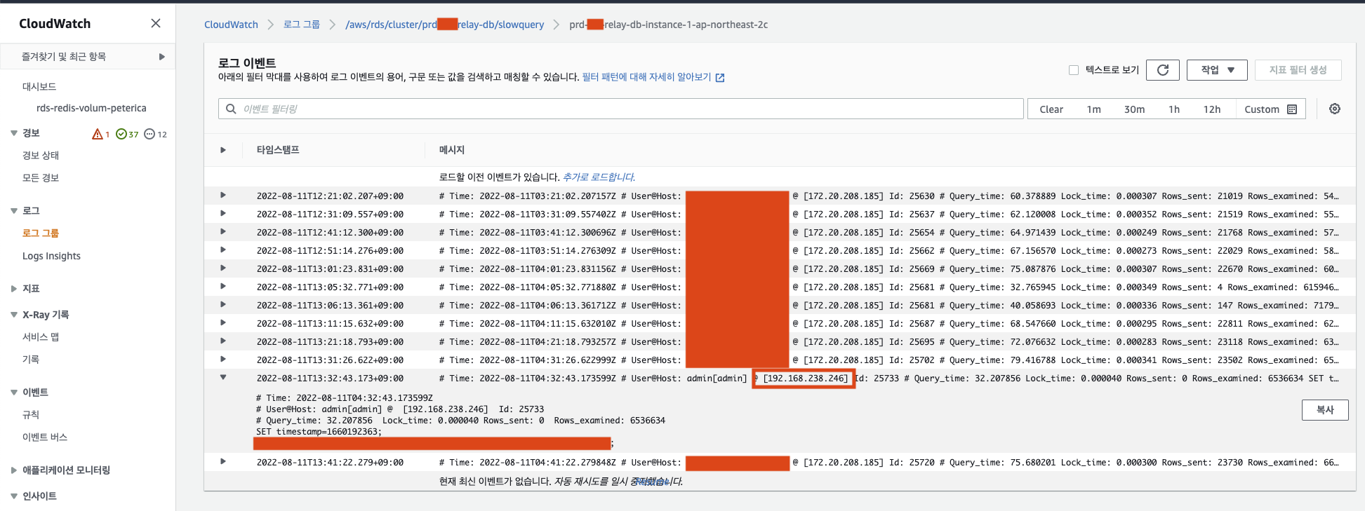 ㅁ CloudWatch slowquery 확인 방법