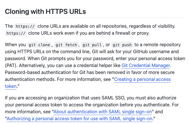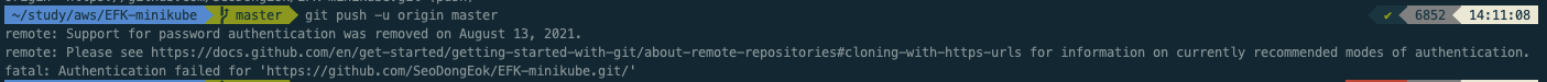 remote: Support for password authentication was removed on August 13, 2021. remote: Please see https://docs.github.com/en/get-started/getting-started-with-git/about-remote-repositories#cloning-with-https-urls for information on currently recommended modes of authentication. fatal: Authentication failed for 'https://github.com/SeoDongEok/EFK-minikube.git/'