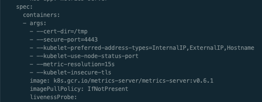 참고: 명령 및 이미지 값은 Metrics Server가 배포된 방식과 이미지가 저장된 위치에 따라 다를 수 있습니다. 명령에 --secure-port 파라미터가 포함되어 있는 경우 포드에서 노출한 포트(앞의 예제에서