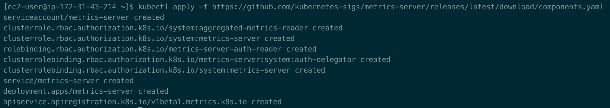 $ kubectl apply -f https://github.com/kubernetes-sigs/metrics-server/releases/latest/download/components.yaml