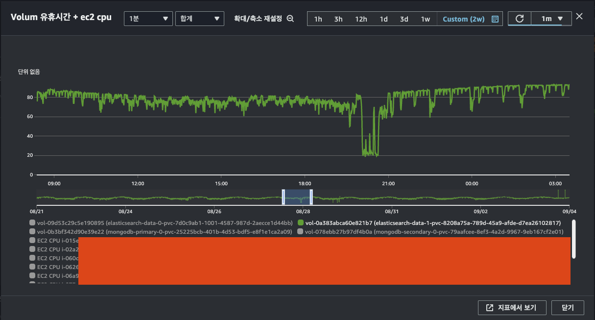 ㅇ CloudWatch에 Volume 지표를 모니터링 중에 ES Data-1의 유휴시간에 특이사항을 발견하였다.