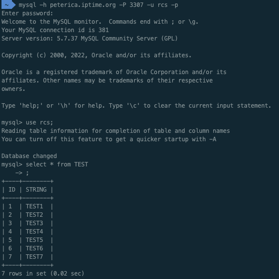 $ mysql -h peterica.iptime.org -P 3307 -u rcs -p