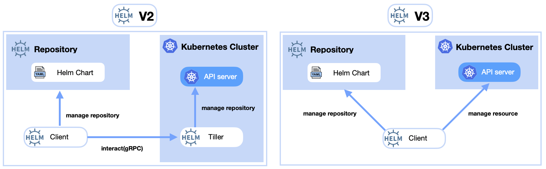 Helm V2에서 Tiller와 Client는 서로 gRPC로 통신을 했으나, V3부터는 Client에서 바로 API Server로 요청한다.