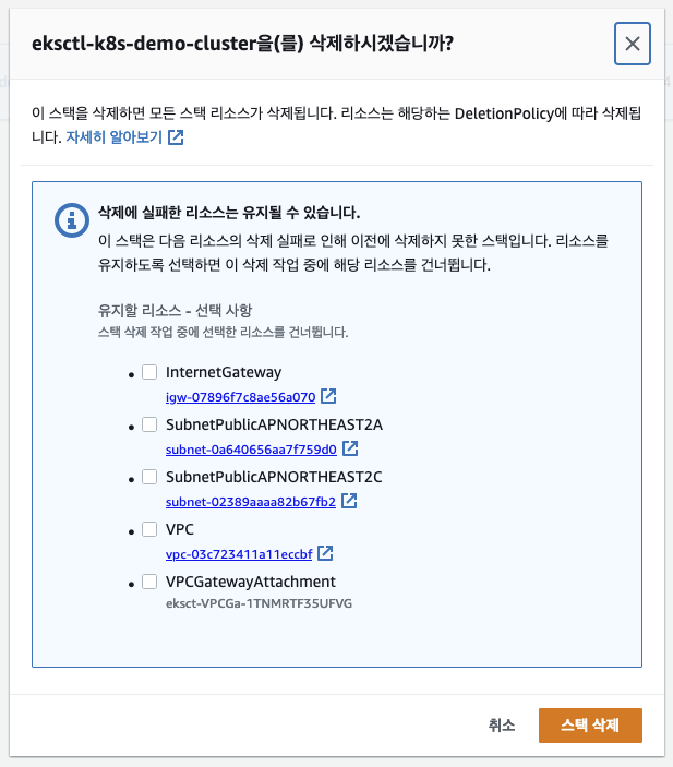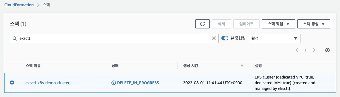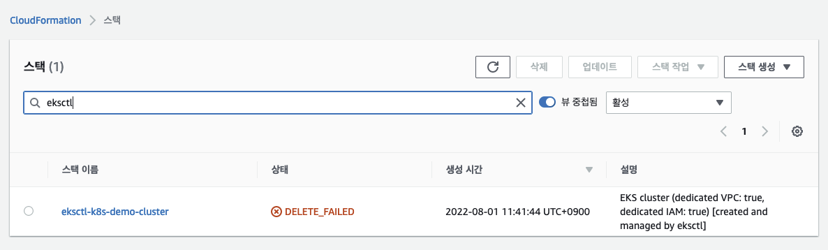 ㅇ EKS는 유지하는 비용이 발생한다. 그래서 사용하지 않은 EKS는 삭제처리 하였는데, CloudFormation의 스택은 그대로 남아있었다.