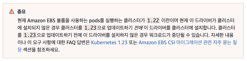 EKS 클러스터가 1.22 이전이며 현재 CSI driver가 클러스터에 설치되지 않은 경우 클러스터를 1.23으로 업데이트하기 전에 이 드라이버를 클러스터에 설치해야한다고 권고 하고 있다.