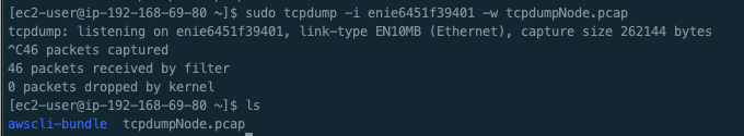 $ sudo tcpdump -i enie6451f39401 -w tcpdumpNode.pcap