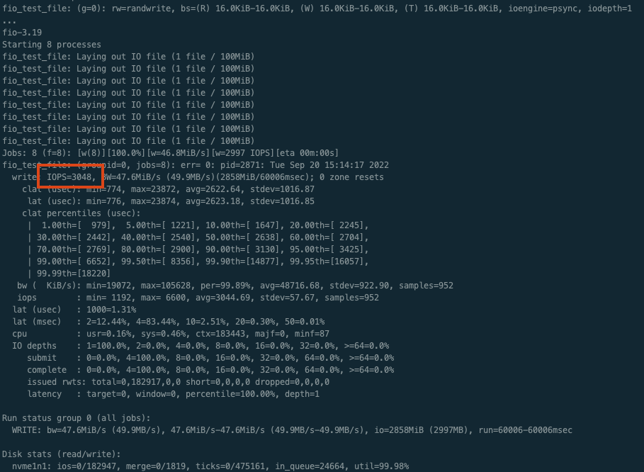 ㅇ IOPS가 3048이 측정되었다. 볼륨에 대한 포퍼먼스는 입증된 것이다.