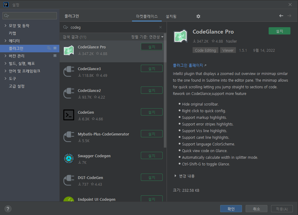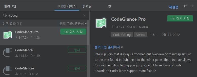 ㅇ 긴 코드를 미니맵 형태로 에디터 창에 표시하는 CodeGlance 플로그인 설치 과정 정리