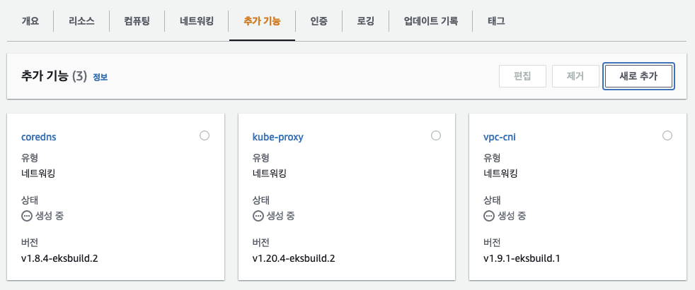 ㅇ 테스트로 생성된 EKS에는 추가기능이 존재하지 않아서 일단 운영과 동일한 버젼으로 생성을 수행하였다.