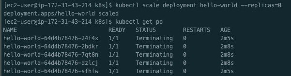 ㅇ replicas를 0으로 변경하여 모든 pod를 Terminating 한다.