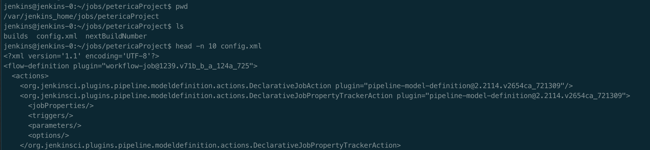 ㅇ 이전 (Helm으로 jenkins 설치하기) 글에 생성한 petericaProject의 구성정보가 위의 그림처럼 /var/jenkins_home/jobs/petericaProject 위치에 저장되어있다.