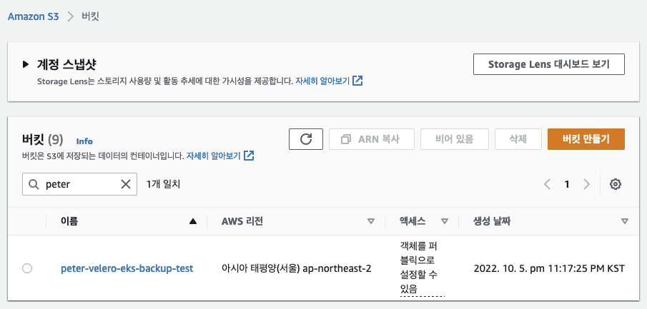 ㅇ 백업을 위한 peter-velero-eks-backup-test S3를 만든다.