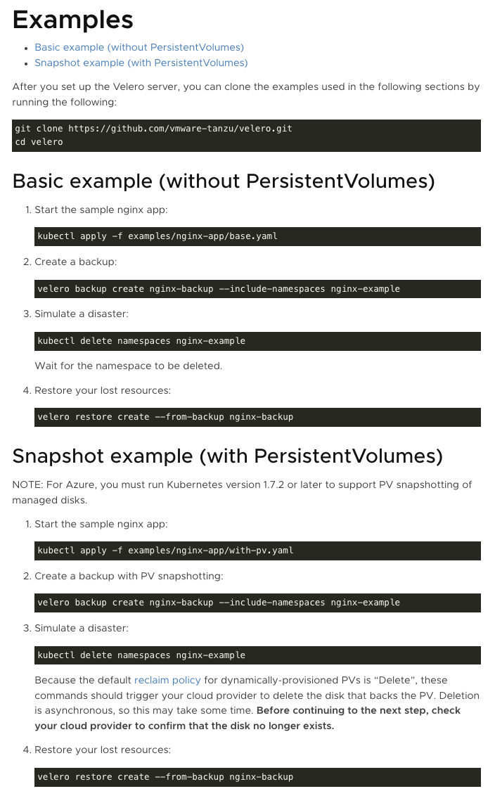 ㅇ Velero에서 제공하는 실습 예제 페이지