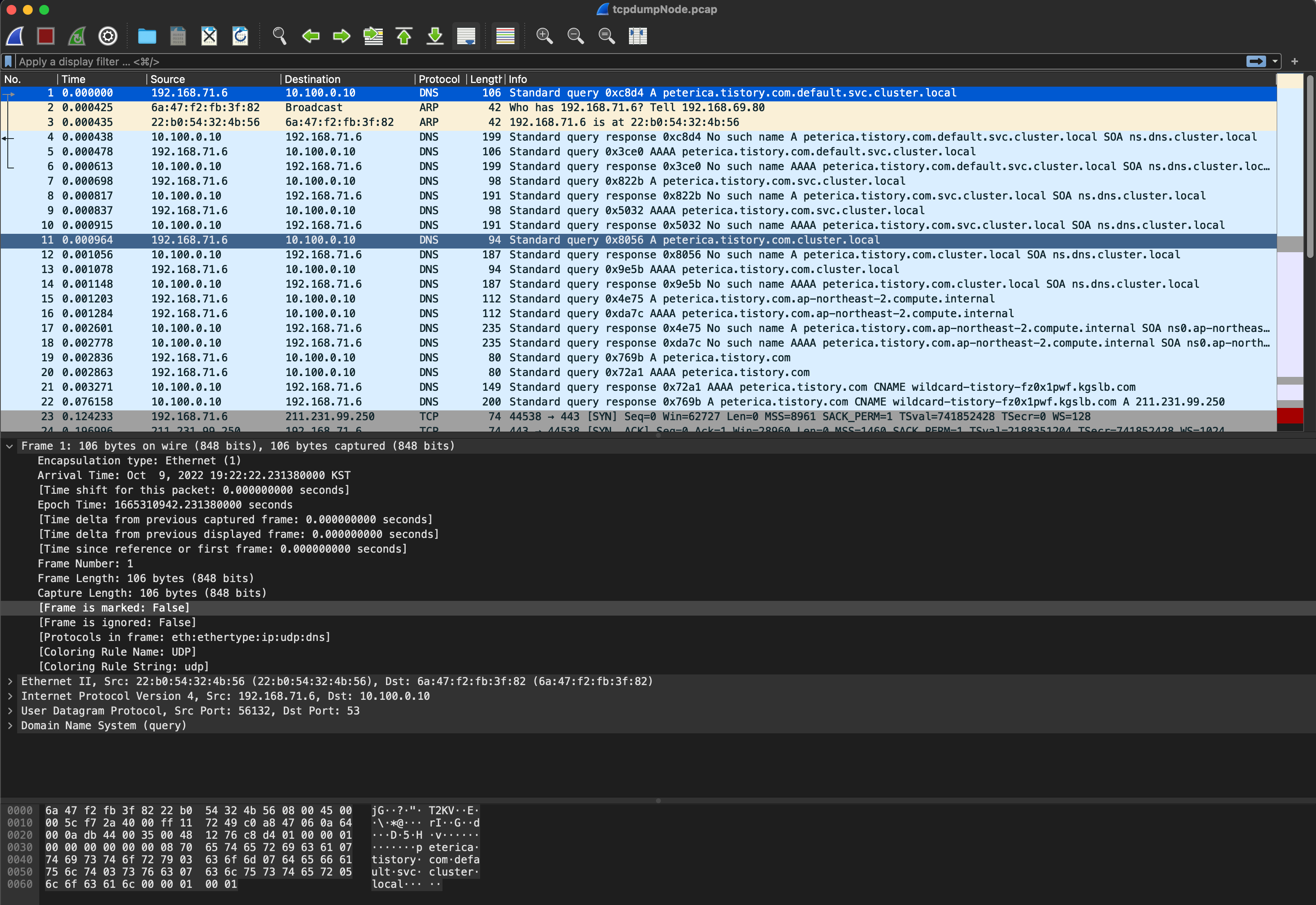 ㅇ 제일 처음의 Standard query 0xc8d4 A peterica.tistory.co.default.svc.cluster.local 부분을 살펴 보자