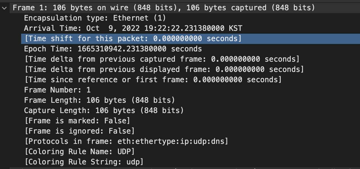 ㄴ 패킷의 캡슐화 종류. 위 그림에서는 Ethernet (1)이라고 되어 있으므로 Ethernet 2 패킷으로 캡슐화되어 있음을 알 수 있다.