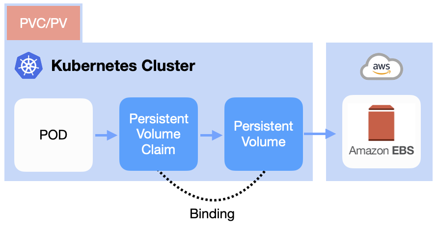 먼저 AWS 볼륨이 생성되고 쿠버네티스 API서버로 PV를 생성해 쿠버네티스에 등록한다. PV가 생성되면 크기와 지원 가능한 접근 모드를 지정해야 하는데, 먼저 최소 용량과 접근 모드를 명시한 PVC 생성한다. 그런 다음 PVC를 쿠버네티스 API 서버에 게시하고 쿠버네티스는 적절한 PV를 찾아 클레임에 볼륨을 바인딩한다. 그리하여 최종적으로 PVC는 POD 내부의 볼륨 중 하나로 사용될 수 있다. AWS 볼륨 -> PV -> PVC 순으로 생성되는 것이다. PVC는 namespace로 나뉘어 관리되지만, PV는 Cluster에 종속되기 때문에 namespace에 종속되지 않고 공용으로 사용할 수 있다. PV와 PVC는 일대일로 연결되어진다. 다만 이 설명은 AWS EBS에 대한 것이다.
