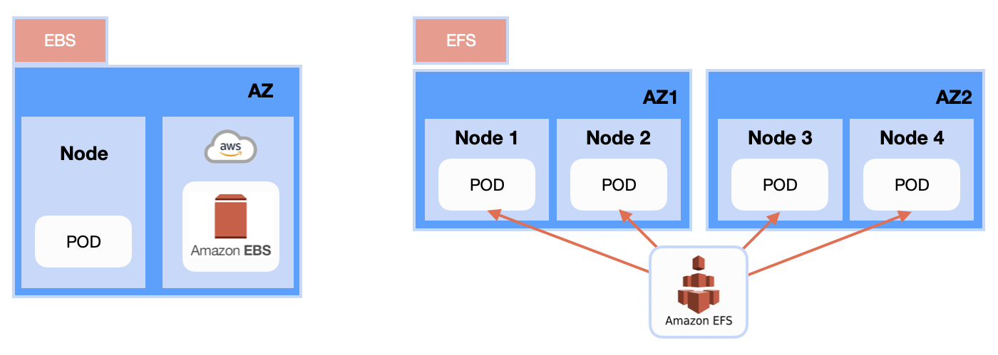현재 사용하고 있는 AWS 환경 기준으로 EBS와 EFS의 간략한 차이를 이해해야한다. EBS의 경우 accessModes가 노드 하나에만 읽기쓰기 가능만 지원된다. 그 이유는 EBS 볼륨은 Available Zone(가용영역)에 속하는 스토리지이기 때문에 가용영역을 넘어서는 노드에는 공유할 수 없다. 그래서 쿠버네티스 환경에서 동적으로 할당되는 pod가 어느 가용영역에 속할 지 모르기 때문에 EBS의 경우 하나의 노드에만 볼륨을 마운트 할 수 있다. 이를 넘어서는 것이 EFS이다. EFS의 위치는 VPC안에 속해 있지만 AZ과 별개로 넘어서 VPC 안에 속해 있다.