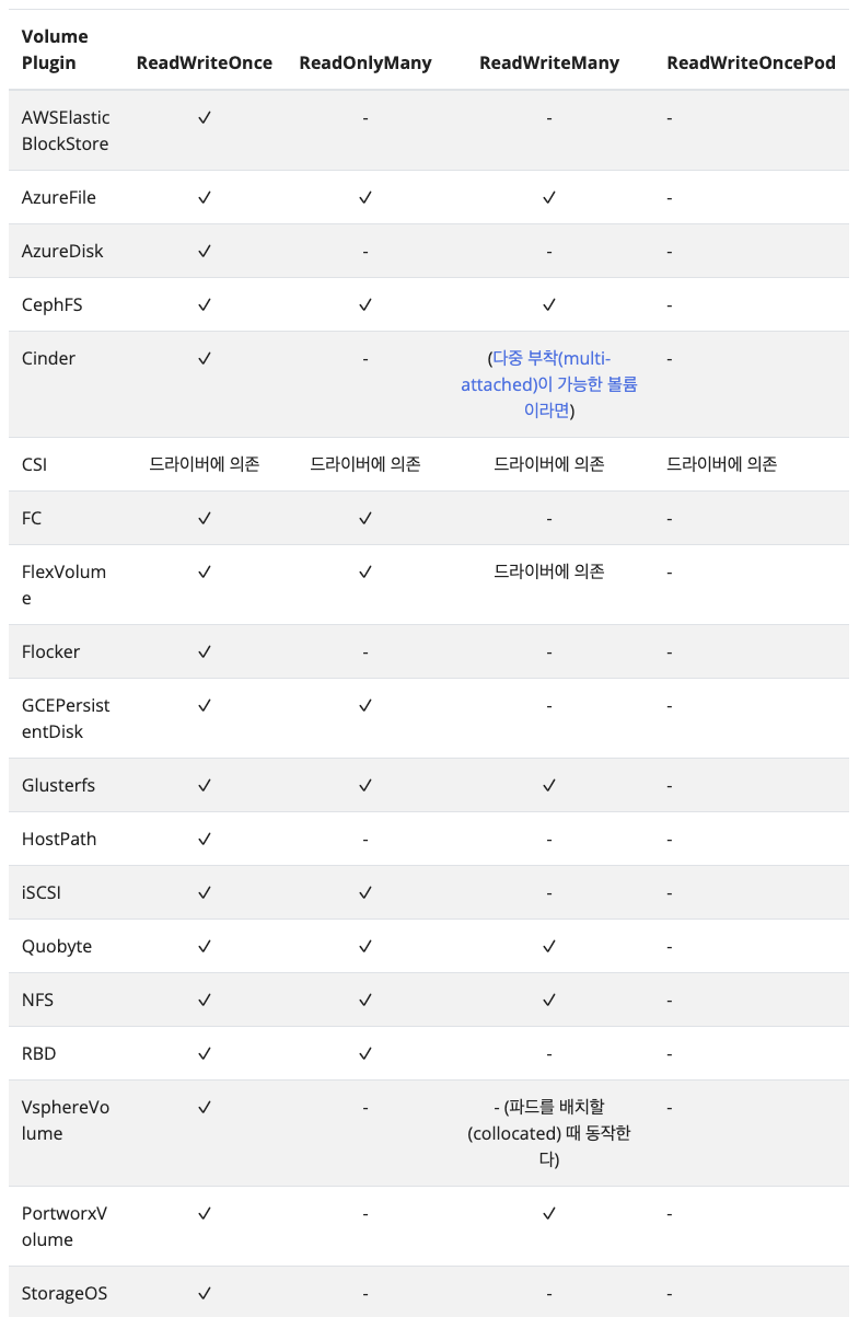 ㅇ ReadWriteOnce: 노드 하나에만 읽기쓰기 가능